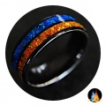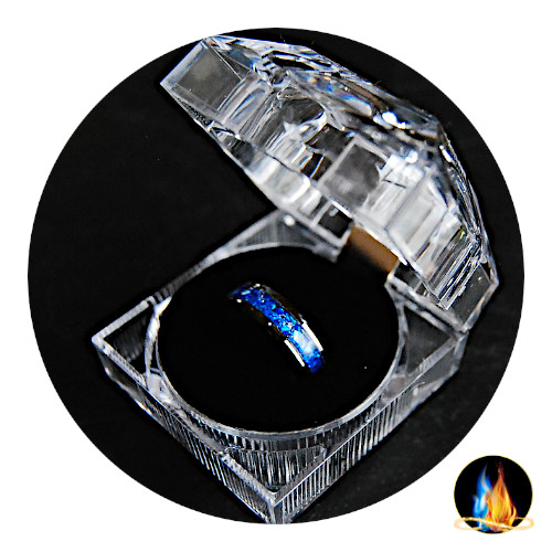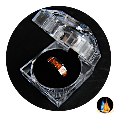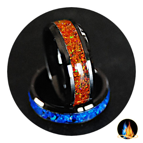 This beautiful wedding ring set is carefully inlayed with Orange Fire and Blue Ice Opal in matching 8mm and 6mm Black Ceramic Bands. Encased in extra hard resin which when finished produces a brilliant 3D finish. Our Crushed Opal Rings feature a very durable waterproof finish for daily wear!