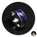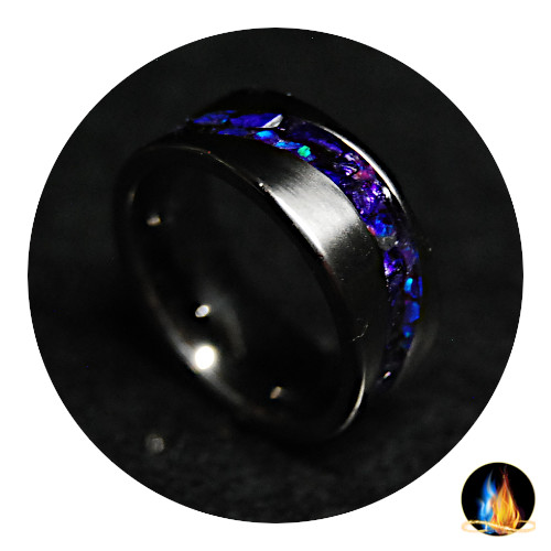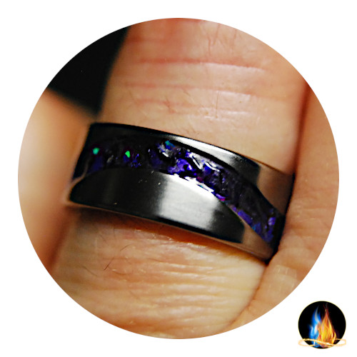Beautiful 'S' Wave Titanium Ring inlaid with Indigo Opal and Purple Glass Shards on Comfort Band. The Opal Glass inlay is encased in acrylate for a high gloss, very durable waterproof finish for daily wear!