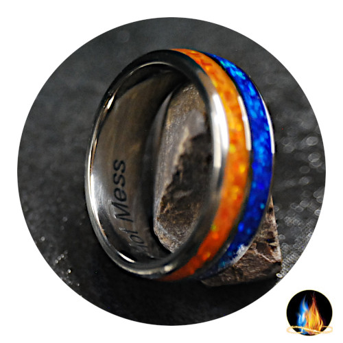 Dual Channel Titanium Ring inlaid with Orange and Blue Crushed Opal on Comfort Band. The Orange Fire & Ice Blue Crushed Opal inlay is encased in acrylate for a high gloss, very durable waterproof finish for daily wear!
