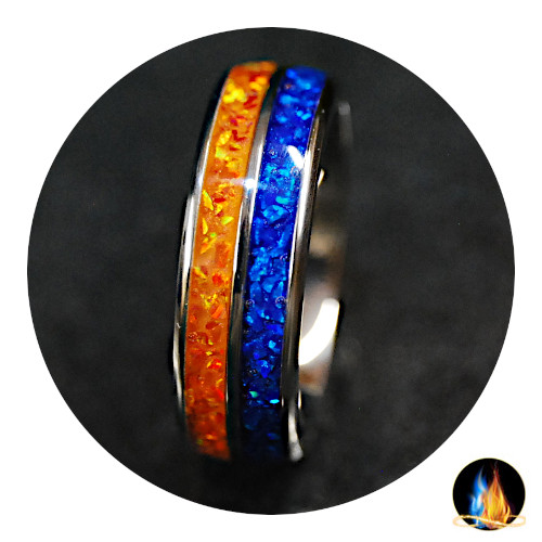 Orange Fire Ice Blue Opal Ring 8mm Dual Channel Titanium